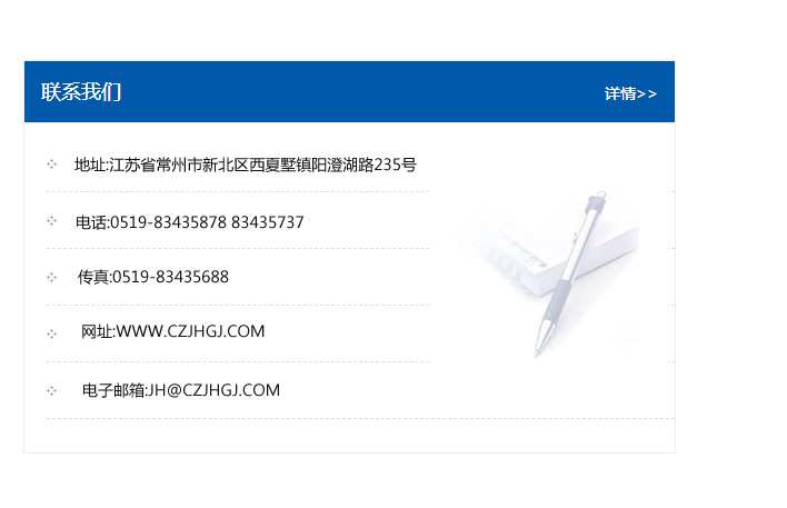 地址:常州市新北區友邦商務大廈1幢16、17層  電話:0519-85101652  傳真:0519-85112595  郵編:213022  網址:www.cz-jiayue_cn.hyhtai.com  郵箱:xiajifengaa@163.com